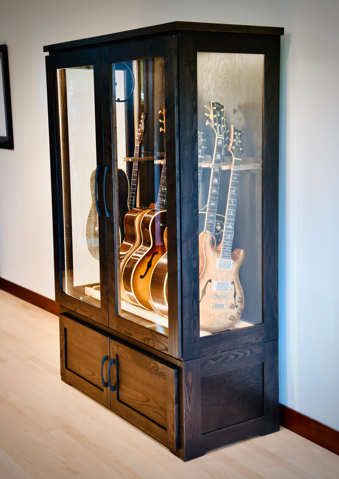 The ClimaCab Traditional is a 48" wide instrument humidor that can comfortably store and display up to 8 instruments in a wide variety of configurations. We offer hanging, resting, and combination options for displaying the instruments. All options can display instruments sideways, at an angle, or facing straight forward with ease.
