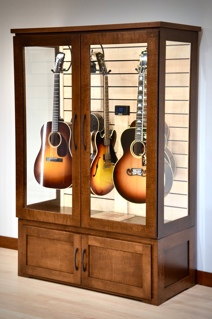 The ClimaCab Traditional is a 48" wide instrument humidor that can comfortably store and display up to 8 instruments in a wide variety of configurations. We offer hanging, resting, and combination options for displaying the instruments. All options can display instruments sideways, at an angle, or facing straight forward with ease.